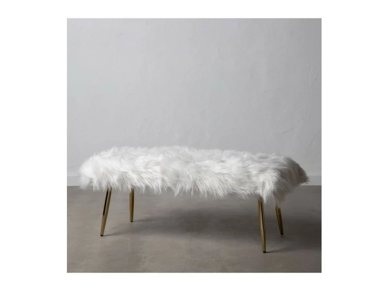 Bout de lit élégant et classique avec pieds en métal doré mat et assise confortable en fausse fourrure amovible blanche.