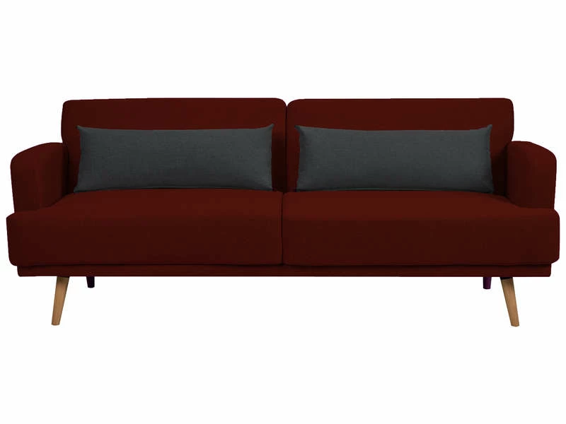 Alliez fonctionnalité et design avec cette banquette convertible en tissu bordeaux pour trois personnes. Généreusement garnie en mousse et dotée de deux coussins moelleux anthracite, elle propose une assise idéale. Pratique, elle se déploie facilement en un couchage d’appoint spacieux pour deux personnes. Sa structure et ses pieds angulaires en bois promettent une stabilité et une solidité durables.