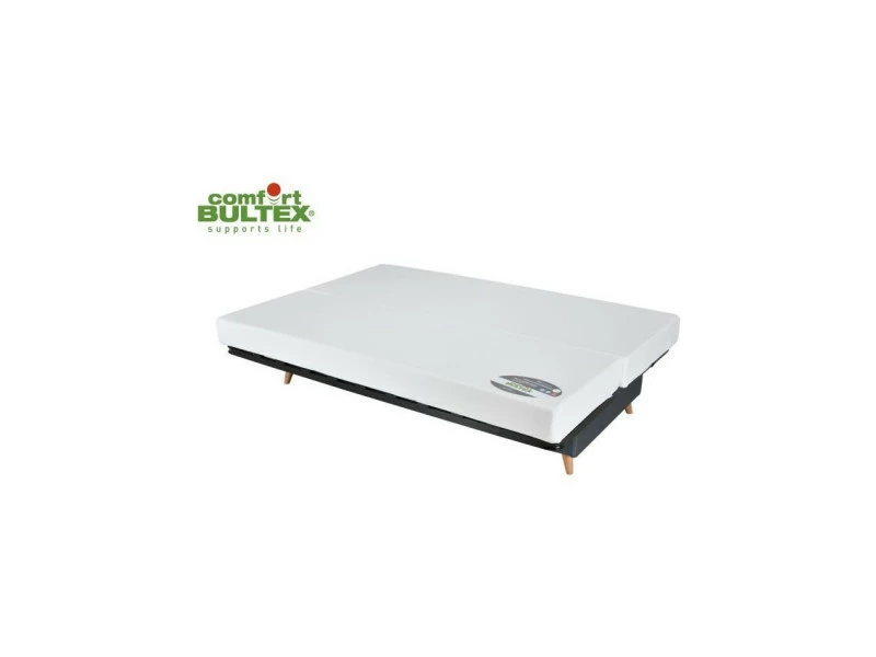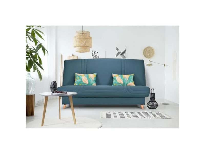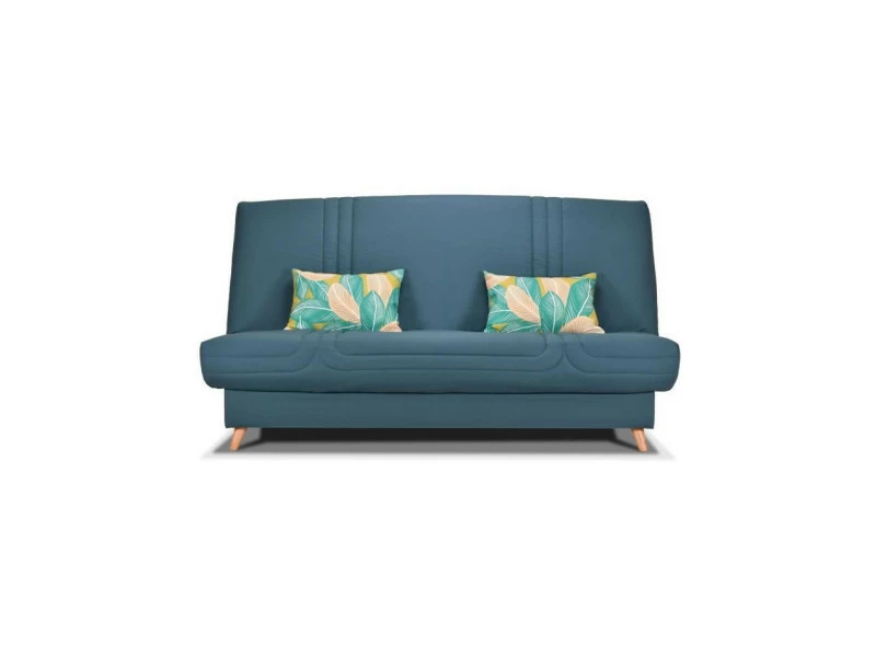 GRUHIER Banquette clic clac BULTEX – Tissu Taupe + Coussins déco jungle – L193 x P95 x H101cm – MONA
