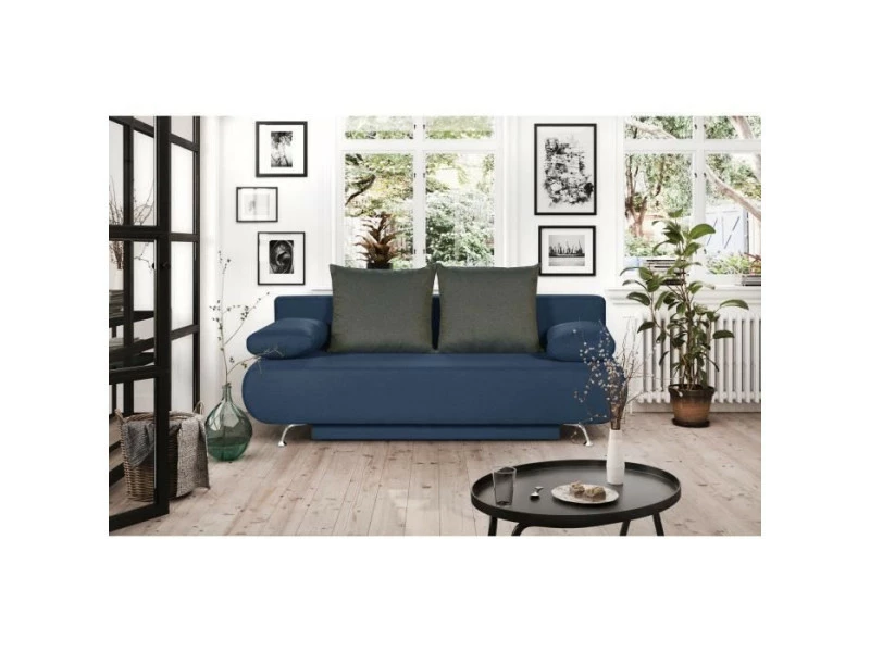 KALIOPE Banquette convertible lit, avec le coffre – Tissu bleu denim et blue chiné – L210 x P92 cm