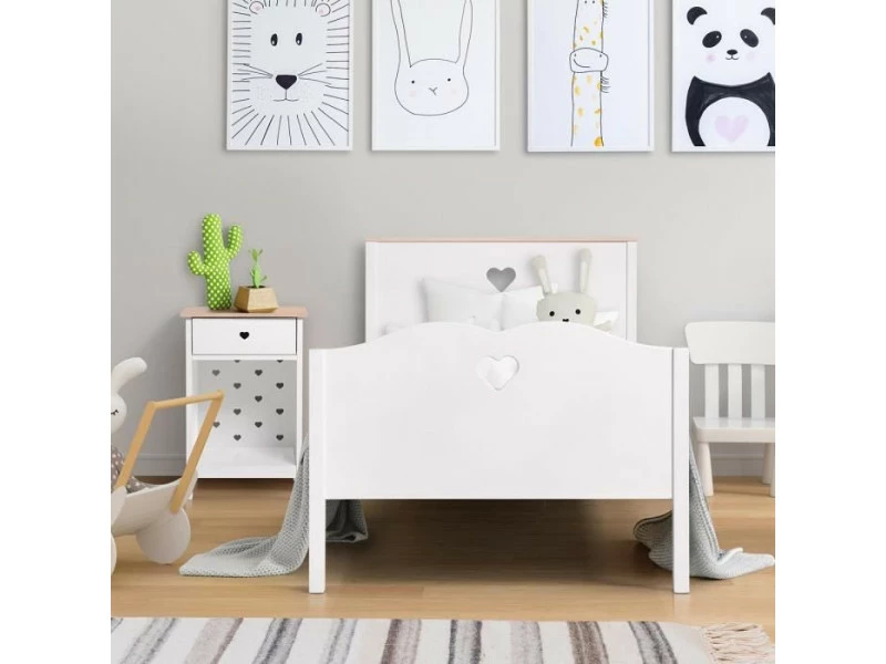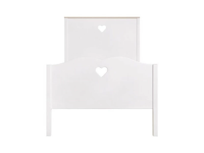 HARO Lit enfant – Coloris Chene/Blanc – Structure en MDF et Pin Massif laqué blanc – Traverses de la tete et du pied de lit en panneaux de particules revetus d’un déocr papier Chene – Couchage : 90 x 190 cm – Sommier inlcus – Livré sans matelas – Dimensions totales : L198 x l98 x H110 cm