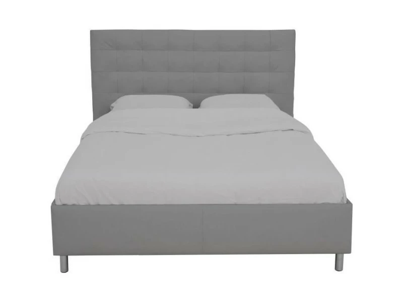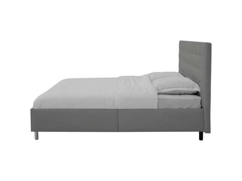 Lit 140×190 cm avec tete de lit revetement PU coloris Gris – Structure Panneaux de particules, bois dur, isorel – Garnissage mousse polyéther densité 16 kg/m3 – Ouate 350 g/m² et 200 g/m² – Revetement 65% PU 21% Polyester 14% Coton