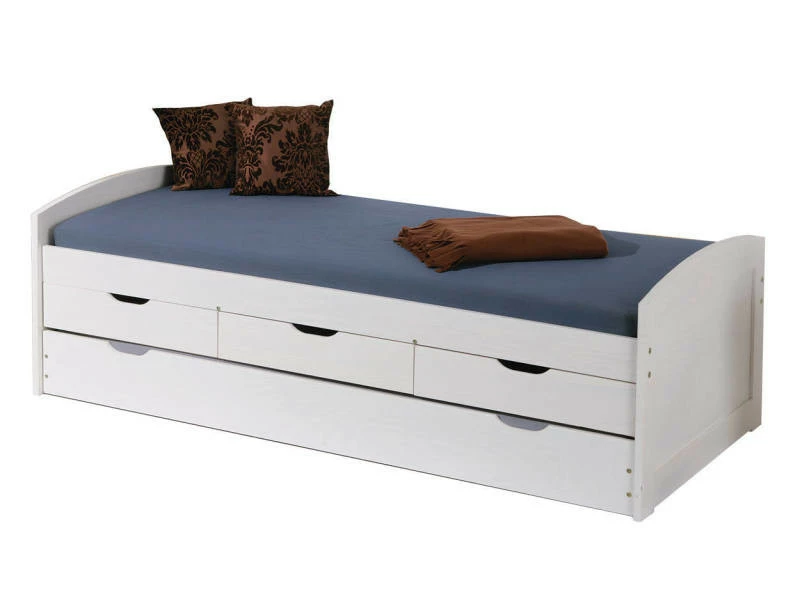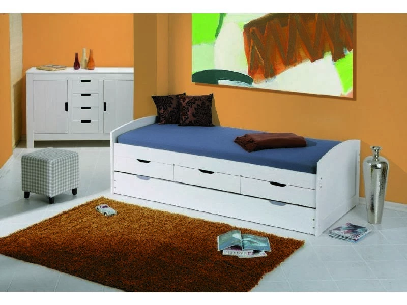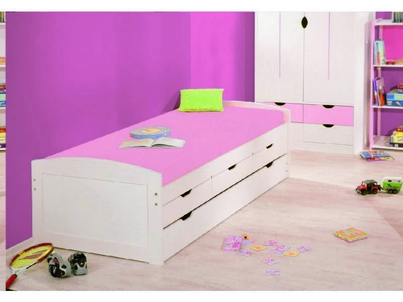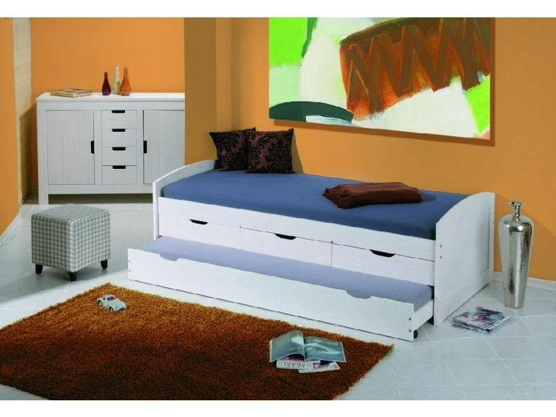 Lit avec tiroirs de rangement et deuxième lit gigogne en pin massif peint à l’eau blanc. Lattes incluses