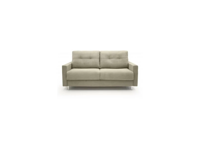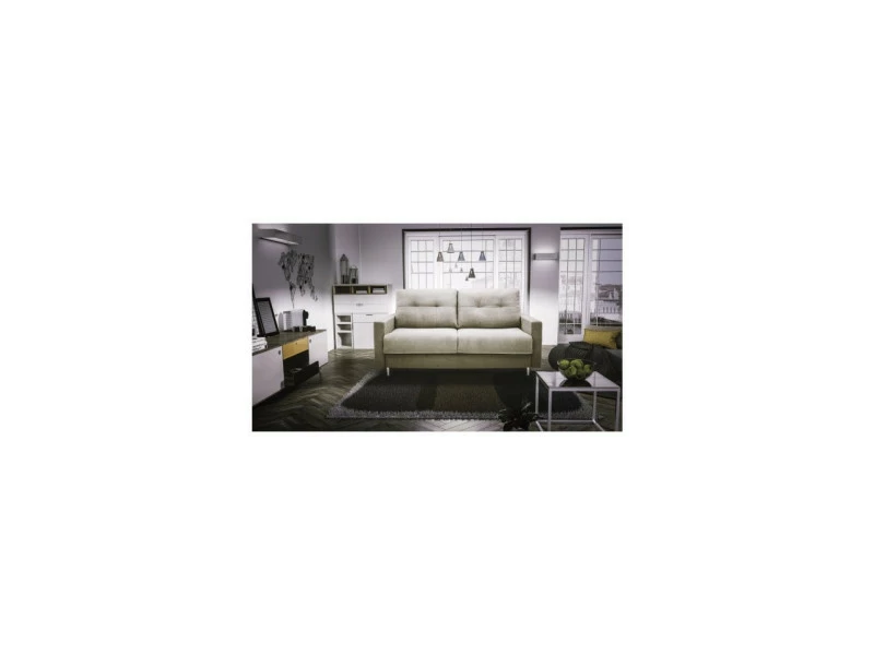 CARACTERISTIQUES Canapé 3 places convertible Tissu Dublin coloris 14 beige Matelas 140×195 x h13 Densité 28 Kg/m³ Structure portante en aggloméré de particules de bois. Garnissage: polyuréthane expansé à densité différenciée, recouvert dune couche de fibre acrylique Suspensions: mécanique électro soudé Sangles élastiques entrecroisées sous lassise Coussins: assise en polyuréthane expansé– densité 35 et 28 Kg/m³ recouvert dune couche de fibre acrylique 200 gr. Dossier en flocons de fibres de polyester creuses Revêtement: entièrement déhoussable au moyen de zips ou de velcros Pieds: métal H 13 cm Dimensions: (LxHxP en cm) 190 x 91 x 96 Origine de fabrication: Italie Couleur: beige